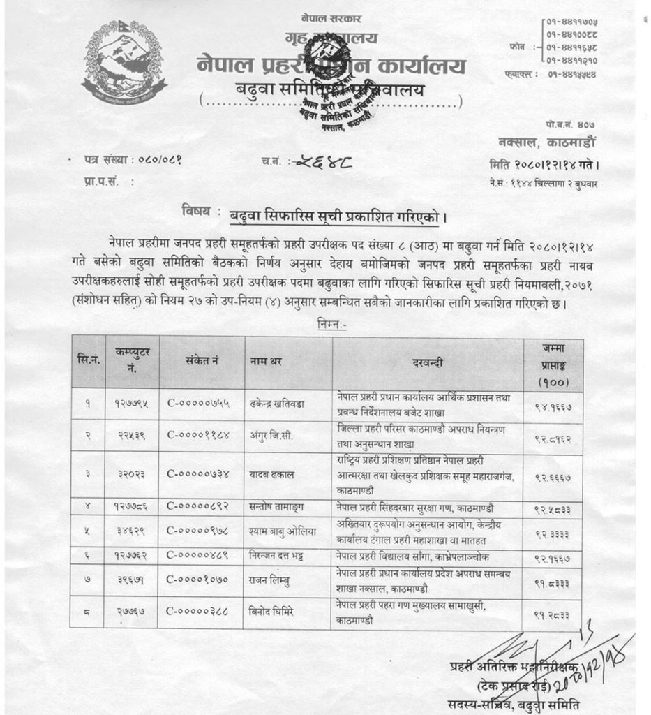 डीएसपी ढकेन्द्र खतिवडा, अंगुर जिसी, यादव ढकाल, सन्तोष तामाङ, श्याम बाबु ओलिया, निरन्जन दत्त भट्ट, राजन लिम्बु र विनोद घिमिरेलाई एसपीमा बढुवा गर्न सिफारिस गरिएको हो ।