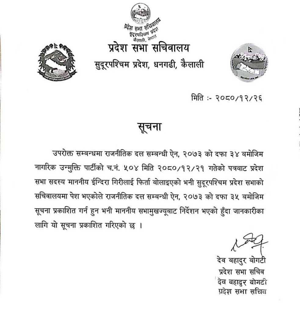 सूचनामा प्रदेशसभा सदस्य माननीय इन्दिरा गिरीलाई फिर्ता बोलाइएको भनी सुदूरपश्चिम प्रदेशसभाको सचिवलयमा पेश भएकाले राजनीतिक दलसम्बन्धी ऐन २०७३ को दफा ३५ बमोजिम सूचना प्रकाशित गर्न सभामुखले निर्देशन भएको उल्लेख गरिएको छ ।