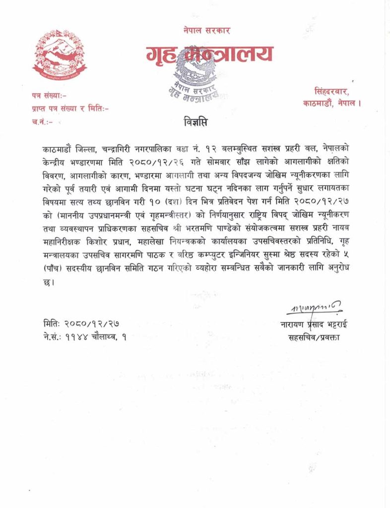 काठमाडौँ । काठमाडौँको चन्द्रागिरी नगरपालिका सतुङगलस्थित सशस्त्र प्रहरी बलको गोदाम घरमा सोमबार भएको आगलागीको घटना छानबिन गर्न गृहमन्त्रालयले अर्को समिति बनाएको छ ।